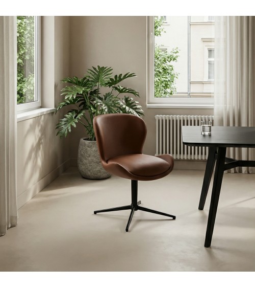 The Nicklas dining chair features a dark brown 100% leather seat and backrest with foam padding for a medium-soft comfort level. The frame and central legs are crafted from black metal, providing a sturdy base that supports a 360 swivel seat with a back-turn function. Its clean lines and premium materials make it a perfect fit for Scandinavian, industrial, and Japandi interiors. Designed for daily use in private homes, the chair measures 50 cm in seat height and 83 cm in total height. Delivered as a set of two; assembly required. Indoor use only.