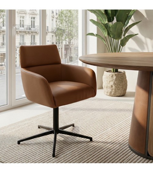 The Marco dining chair features a warm light brown 100% leather seat and backrest with integrated armrests and foam padding. The sturdy black metal frame features a central leg base providing a 360 swivel function with a back-turn mechanism. Its blend of high-quality leather and metal legs complements Scandinavian, industrial, and Japandi styles. Designed for private homes, it offers a seat height of 49 cm and armrests at 63 cm high. Delivered as a single unit; assembly required. Indoor use only.